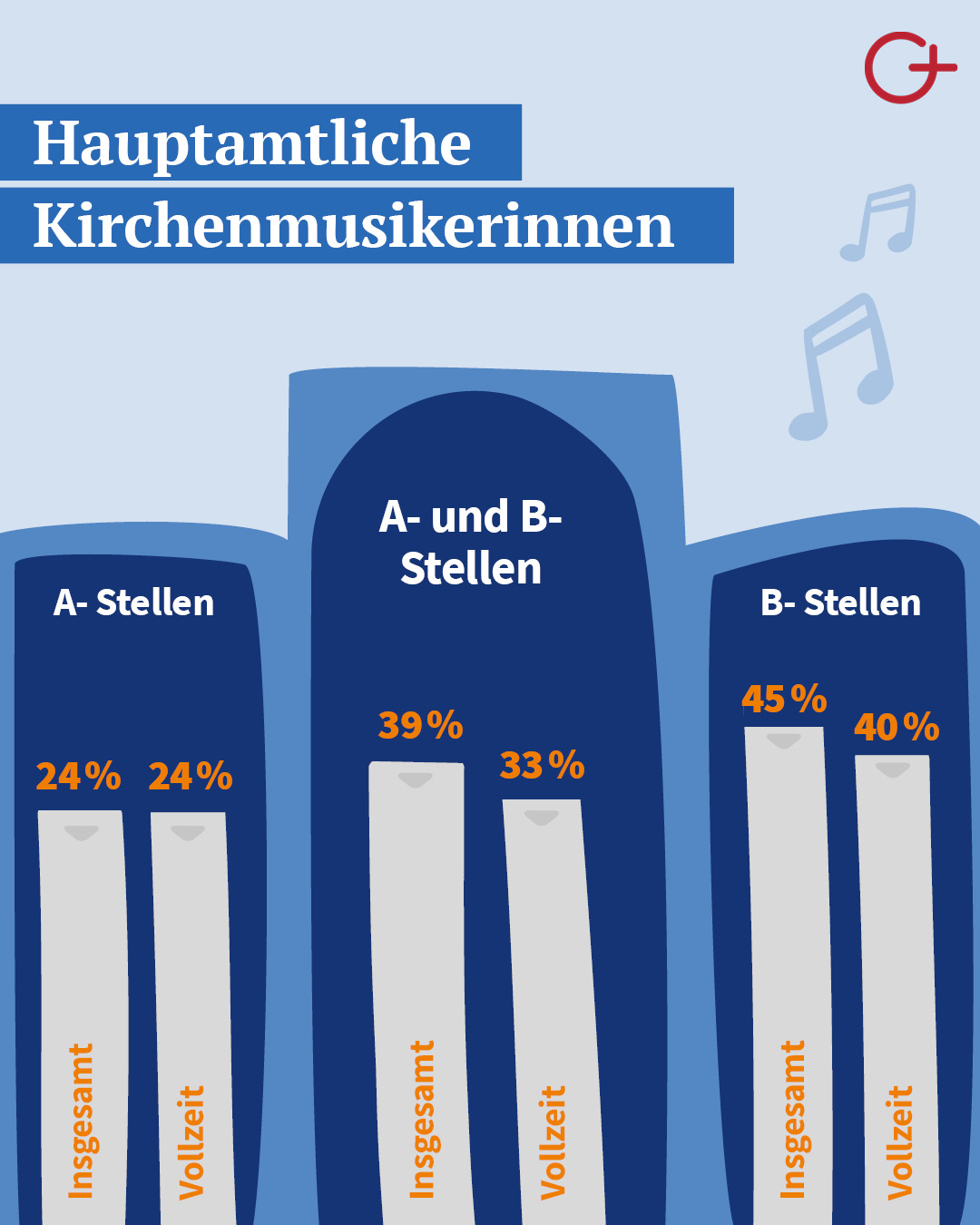 Infografiken zu Frauen in der evangelischen Kirche, auf mittlerer Leitungsebene, im geteilten Leitungsamt, in Vorsitzen, Teilzeitbeschäftigung und der hauptamtlichen Kirchenmusik